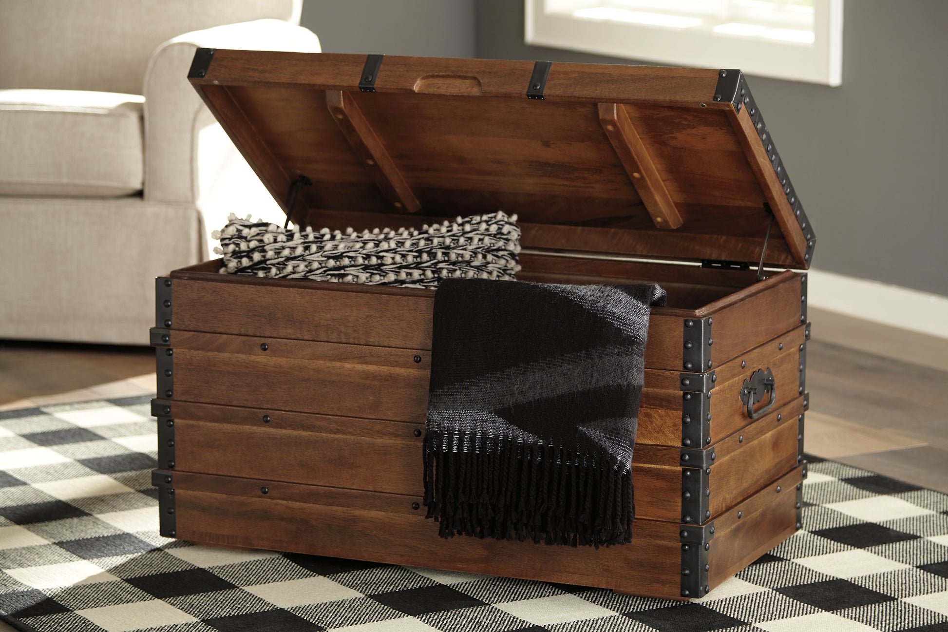 Wooden it be nice? This vintage-inspired trunk is the ideal accent piece for your urban oasis, modern farmhouse or contemporary cottage. Need more convincing? This handsome storage piece does double duty as a casually cool coffee table.